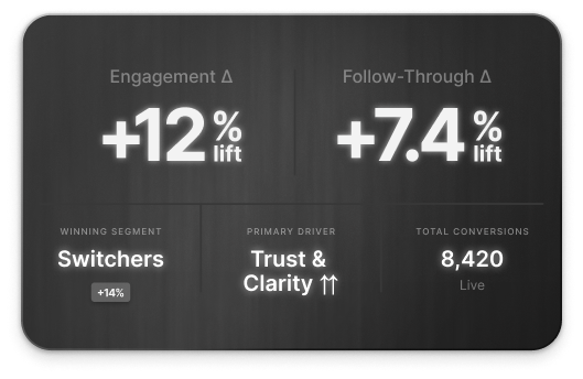 We run controlled message experiments (A/B and multivariate) inside conversations and track which variants change downstream signals—preference, confidence, next-step intent, and conversion proxies—by cohort and region. Lift is reported as clear deltas vs. baseline with sample sizes and confidence.